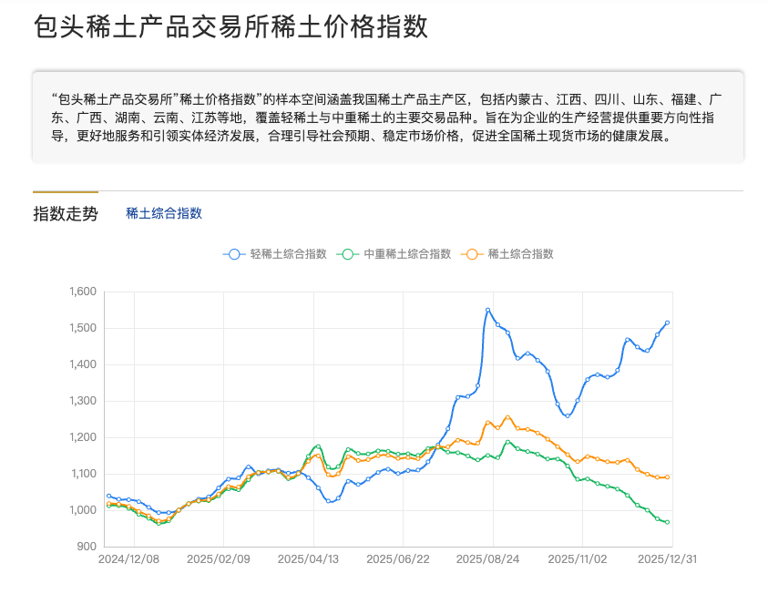据包头稀土产品交易所(简称“稀交所”)1月9日消息,近日,稀土价格指数正式在稀交所官方网站、微信公众号及中国金融信息网、新华财经专业终端、新华财经APP等平台同步上线。详情